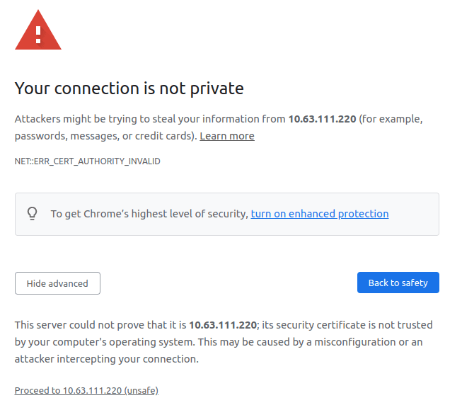 If you have not set up a secure TLS server certificate, LXD uses a self-signed certificate, which will cause a security warning in your browser. Use your browser’s mechanism to continue this time despite the security warning.