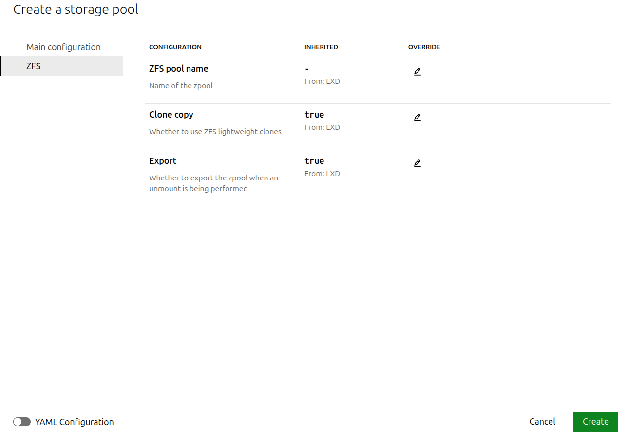 To create a storage pool, select Pools from the Storage section of the main navigation, then click Create pool. On the resulting screen, the Name and Driver fields are required.