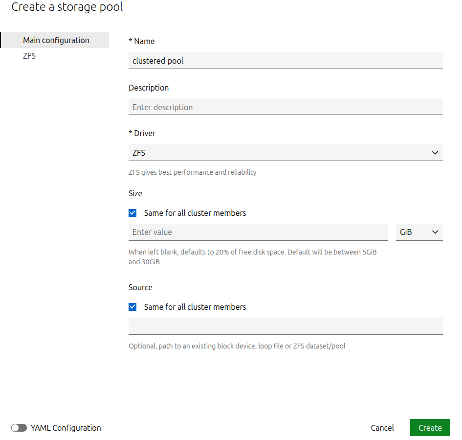 Once you select a driver, the fields below the driver selection dropdown might change. Furthermore, some drivers also offer a secondary settings page, as shown in the example below for the ZFS driver: