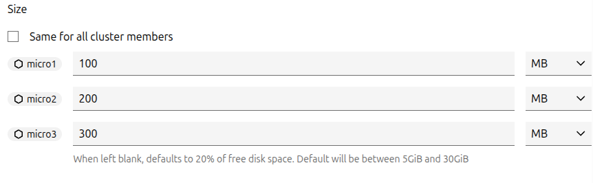 In clustered environments, the Size field appears as a per-member selector, allowing you to configure the size for each cluster member.